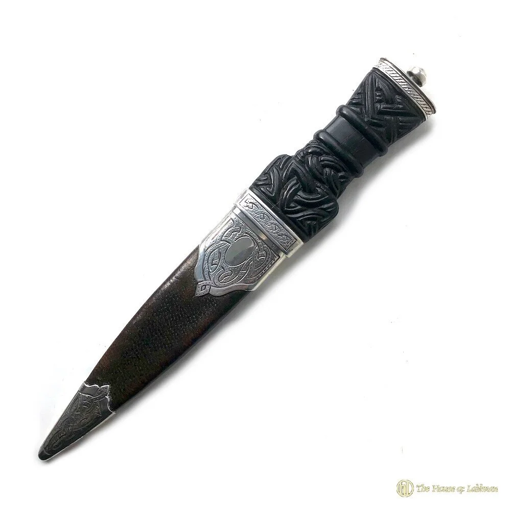 The Gaelic sgian dubh meaning “black knife”, where “black” may refer to the usual colour of the handle of the knife. It is also suggested that “black” means secret, or hidden, as in the word blackmail. This is based on the stories and theories surrounding the knife’s origin and the meaning of “Dubh” in Gaelic, in particular those associated with the Highland custom of depositing weapons at the entrance to a house prior to entering as a guest. Despite this practice, a small twin edged-dagger, (‘Mattucashlass’), concealed under the armpit, combined with a smaller knife, (‘Sgian dubh’).