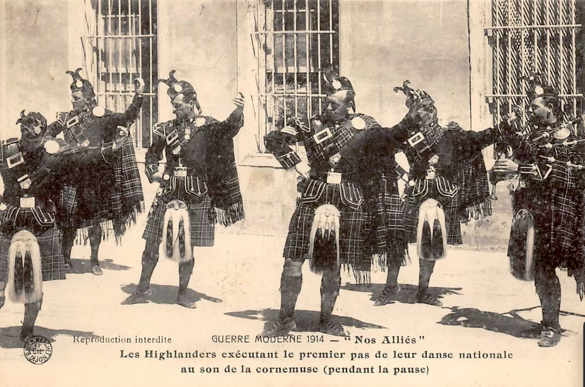 Pipers of the KOSB performing “ the National Dance “ WW1 French postcard showing ‘Modern War’ in 1914